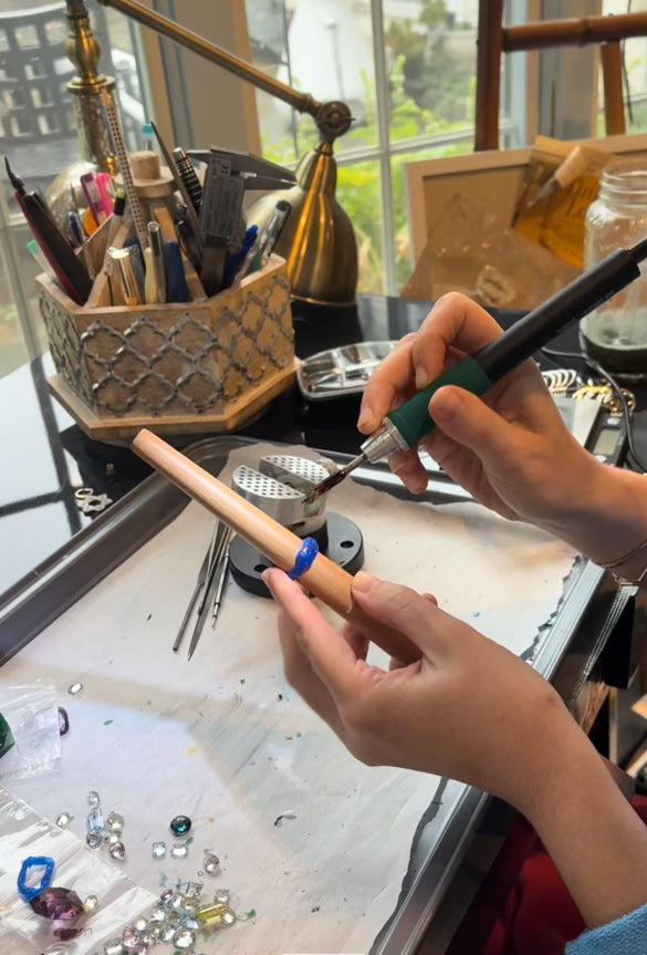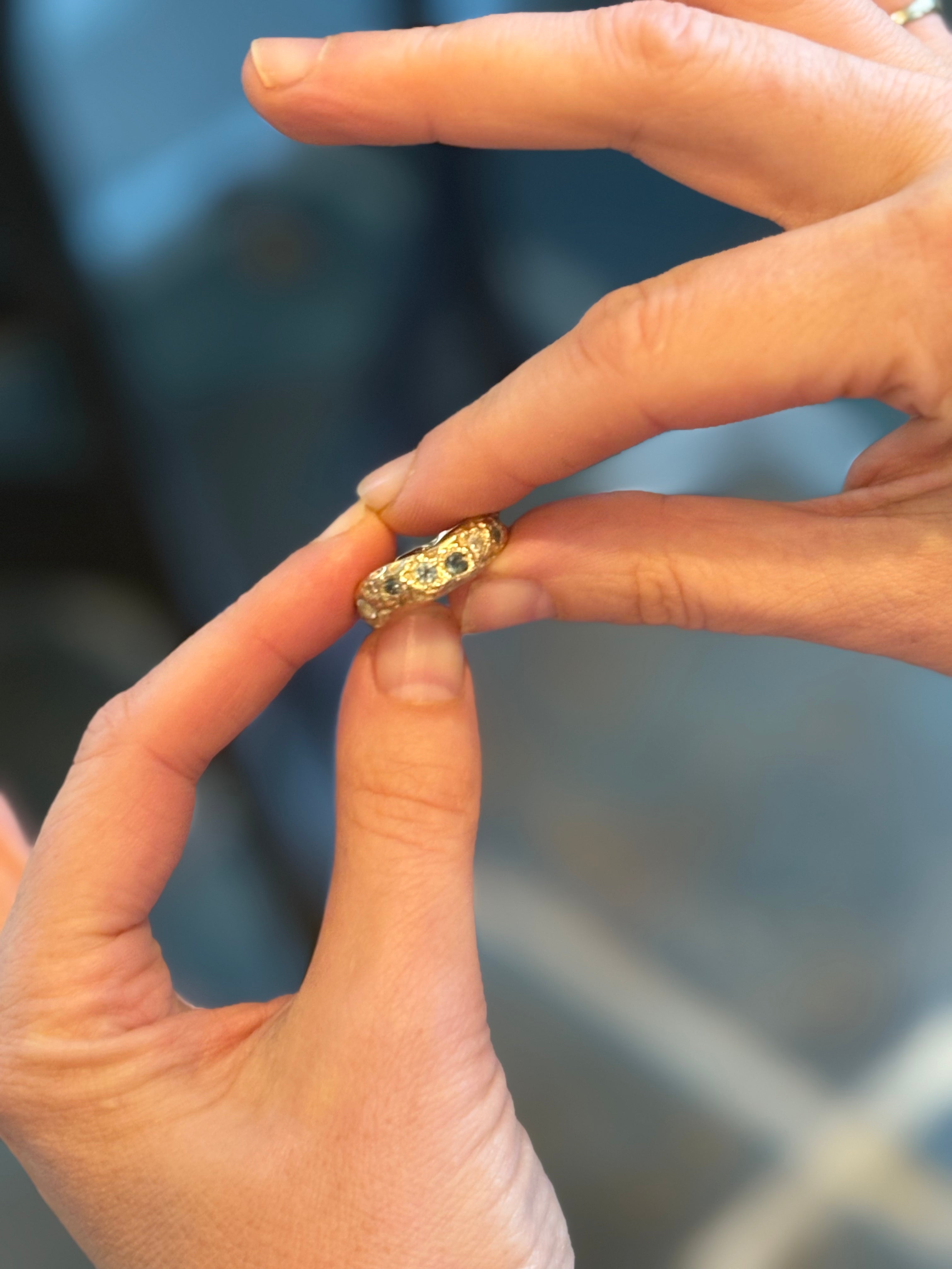 Each piece is made using the lost wax technique, preserving organic form and individuality. From diamond-inset prongs to hand-carved sapphire panels, every detail is intentional and created to become a lasting part of your story.